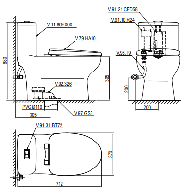 Bàn cầu một khối V809 có kích thước nhỏ gọn chỉ D712 * R370 * C680, phù hợp cho mọi diện tích và yêu cầu sử dụng.