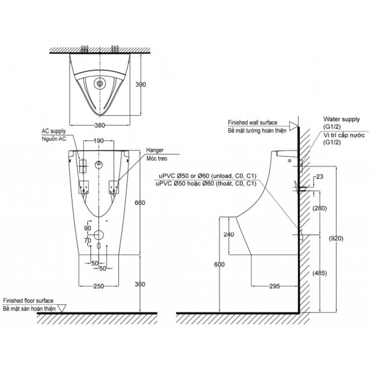 Bồn tiểu nam TOTO USWN902AEV#XW treo tường cảm ứng dùng pin