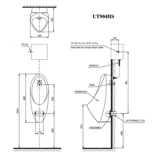 Bồn tiểu nam TOTO UT904HN#XW treo tường cấp nước phía sau