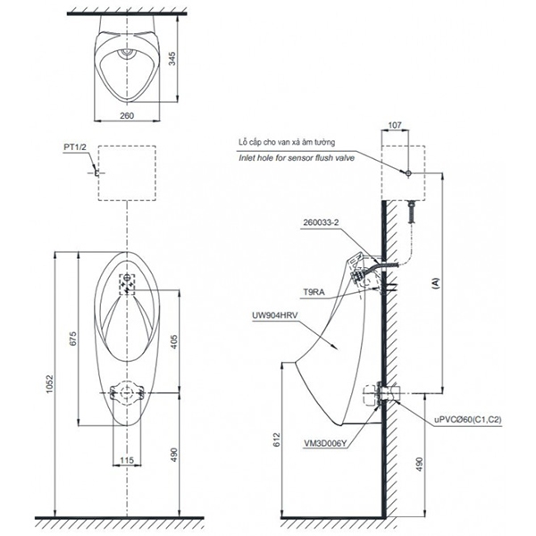 Bồn tiểu nam TOTO UT904HR#XW treo tường cấp nước sau