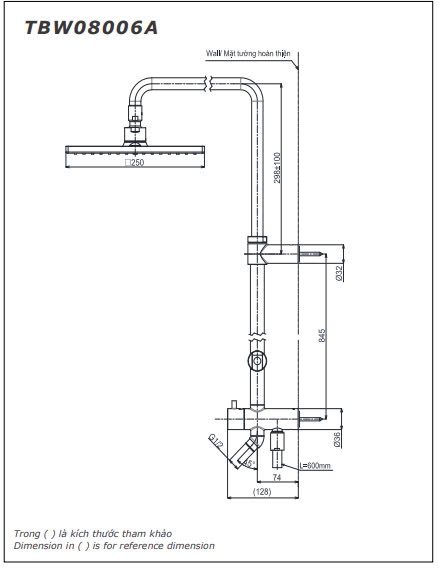 Thân sen tắm TOTO TBW08006A nóng lạnh bát vuông 250mm
